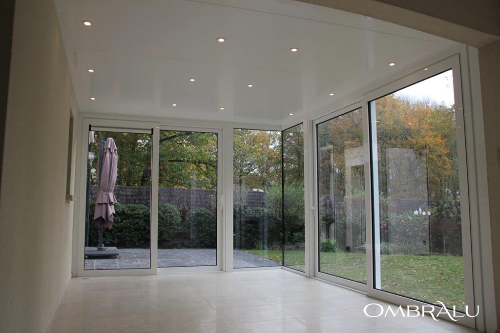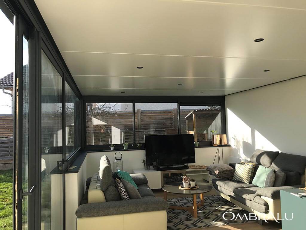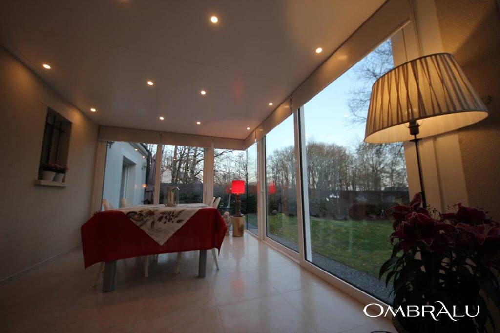 La descente des eaux pluviales est prévue par un tube PVC de 80 mm de diamètre incorporé dans la structure d’un poteau, la rendant invisible. Le chéneau est équipé de la rehausse Soft Line de veranco renforçant l'aspect esthétique de votre véranda ONYX. La toiture entièrement plate et sans chevron, est réalisée avec des panneaux sandwich isolants autoportants de 164 mm d’épaisseur vous garantissant une isolation thermique optimale. L’étanchéité est assurée par une membrane EPDM d’une seule pièce et sur mesure dont les raccords sont vulcanisés à chaud. En option vous pouvez ajouter dans le plafond, des spots d’éclairage pour une ambiance conviviale et chaleureuse.